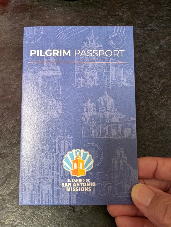 The Pilgrimage Center is a bright and welcoming, place with a small shop and a small cafe. There’s nothing fancy in the cafe but it’s a good place to grab a drink and a snack if you’ve been walking. There are tables outside in some shady areas to sit and relax for a bit. There’s not really a museum, per se, but there are some touch screens with some interesting information about a variety of subjects, including the Camino de San Antonio, the Camino de Santiago, the Riverwalk, and other areas of interest. There is also a display entitled “Hands in Prayer” showcasing the meaning and use of strings of beads from different religions.  There are places where children can do a “craft” of sorts creating ropes of beads. The building is a welcome place to sit and refresh on a hot day. The shop has some nice items in it. Buying a small souvenir helps to support the center so it’s all for a good cause. This is also where you will buy your Pilgrim Passport. For $10 you get your passport and a keychain. The fully stamped passport is what you will need to receive your Compostela upon completion.