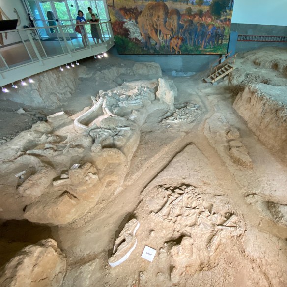 This is what happened back in 1978 to Paul Barron and Eddie Bufkin. Lucky for us that these two guys had a pretty good idea of what they had found and had the presence of mind to excavate it and take it over to Baylor University’s Strecker Museum for further examination. Museum staff identified the object as a femur bone from a Columbian Mammoth and quickly went about organizing a team to begin excavating. Between 1978 and 1990, the dig unearthed the remains of 16 Columbian mammoths. They also found what appeared to be a nursery herd that may have died together in a single natural event. Between 1990 and 1997, six additional mammoths were excavated as well as the remains of a Western camel, an alligator, a dwarf antelope, and a giant tortoise, among other animals.